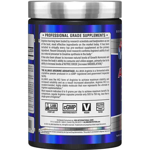 ALLMAX ARGININE عبارة عن مسحوق بلوري أبيض يتم إنتاجه في منشأة مسجلة وفقًا لمعايير التصنيع الجيدة (cGMP) وخاضعة للتفتيش الحكومي. عملية حصرية من 11 مرحلة تستمد هذا الببتيد الأميني القوي من قاعدة نباتية نقية.