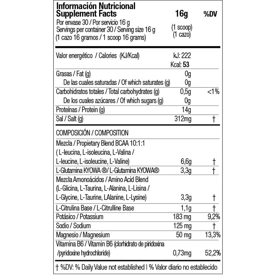 - مُدعّم بـ L-Glutamine و L-Alanine و Taurine و Citrulline لتسريع الاستشفاء وزيادة الطاقة والحيوية.