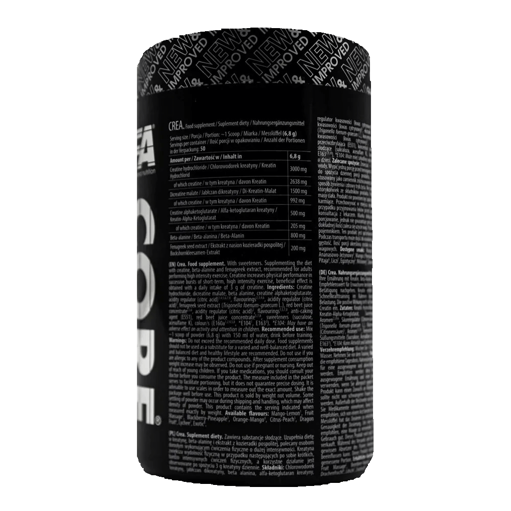 تحتوي كل جرعة من Crea Core Creatine على مزيج قوي من المكونات المبتكرة. حيث يحتوي على Creatine Hydrochloride بمقدار 3000 ملغ، والذي يوفر 2638 ملغ من الكرياتين. بالإضافة إلى ذلك، يحتوي على Dicreatine Malate بمقدار 1500 ملغ و Creatine Alphaketoglutarate بمقدار 500 ملغ.