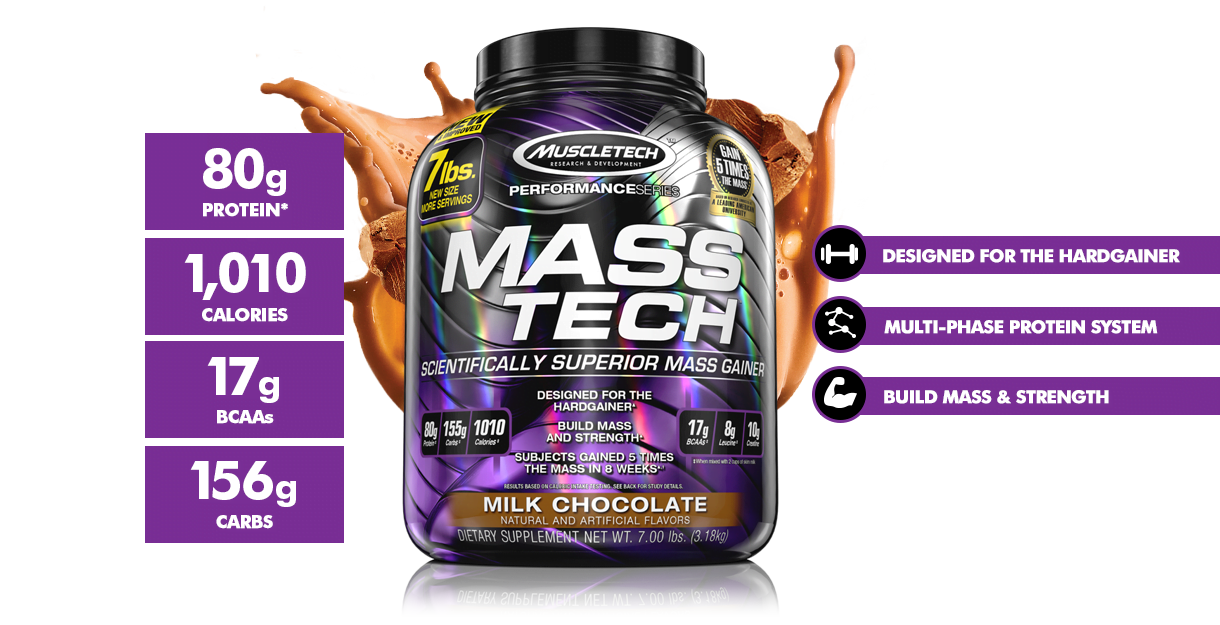 يوفر MASS-TECH جميع العناصر الغذائية التى يحتاجها الجسم لبناء العضلات لمساعدتك على اكتساب الكتلة والقوة وحجم العضلات! يحتوي MASS-TECH EXTREME 2000 على 80 جرام من البروتين ، وأكثر من 400 جرام من الكربوهيدرات و 2270 سعرة حرارية منتجة بكميات كبيرة ، بالإضافة إلى 8.2 جرام من L-leucine (عند مزجه مع 20 أونصة. من الحليب الخالي من الدسم) ، و 10 جرام من الكرياتين ، و 20 من الفيتامينات والمعادن!