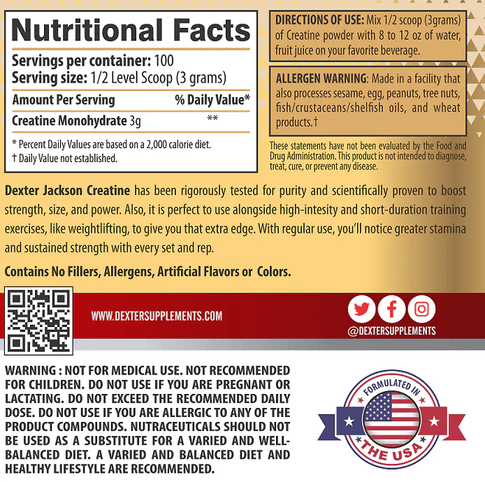 ميكرونايزد كرياتين دكستر جاكسون يزود عضلاتك بكيرياتين نقي، دقيق ومدروس مخبرياً ليتم إيصال حاجة عضلاتك من الكيرياتين بشكل مباشر وبدون أي إضافات أخرى مما يعني أداء رياضي أفضل، حجم عضلي أكبر وقدرة على التدرب لفتراتٍ أطول لنتائج لا يمكن تتخيلها من التضخيم العضلى .